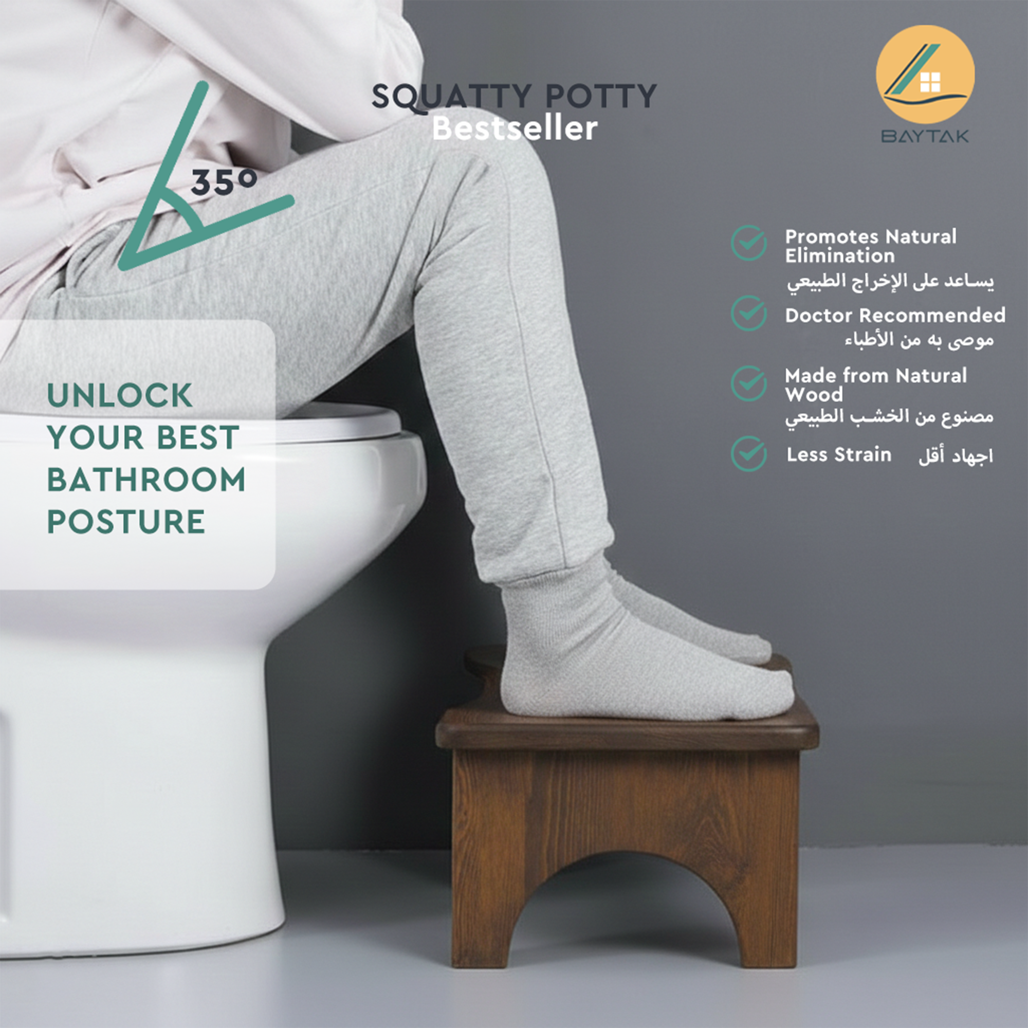 يرفع القدمين لوضعية القرفصاء الطبيعية، مما يقلل من الإجهاد ويسهّل عملية الدخول إلى الحمام. -